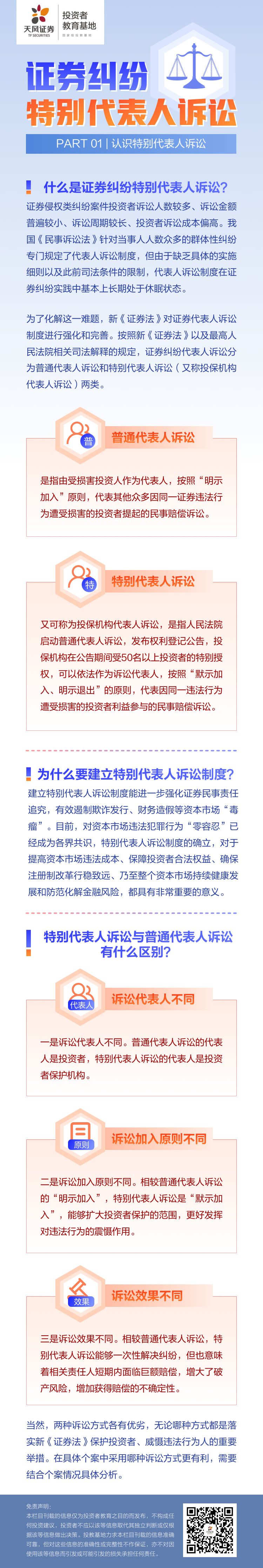 为提升广大投资者法律素养,帮助大家了解证券纠纷特别代表人诉讼制度、特点、原则等方面的知识,天风证券投教基地在2023年1月特别开展“证券纠纷特别代表人诉讼”系列投资者教育活动,敬请关注!