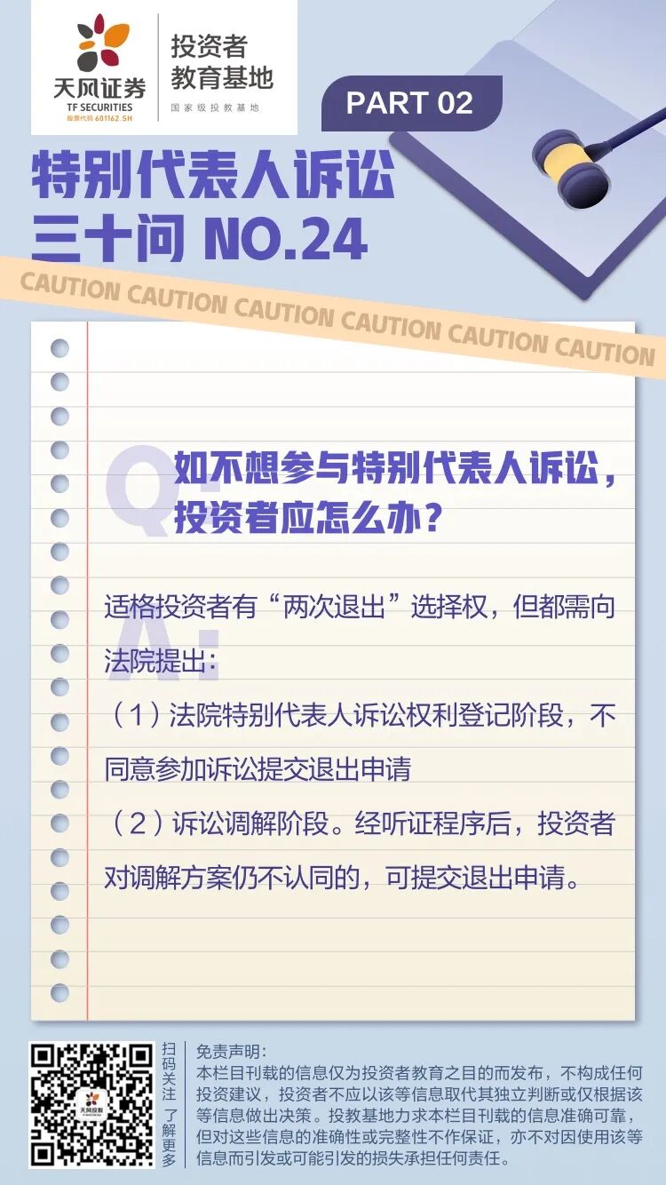 为科普和宣传证券纠纷特别代表人诉讼,天风证券投教基地推出了“特别代表人诉讼三十问”特别专题栏目,将按照投保公司发布的特别代表人诉讼相关概念、知识,每天带您了解一个要点,敬请您关注!