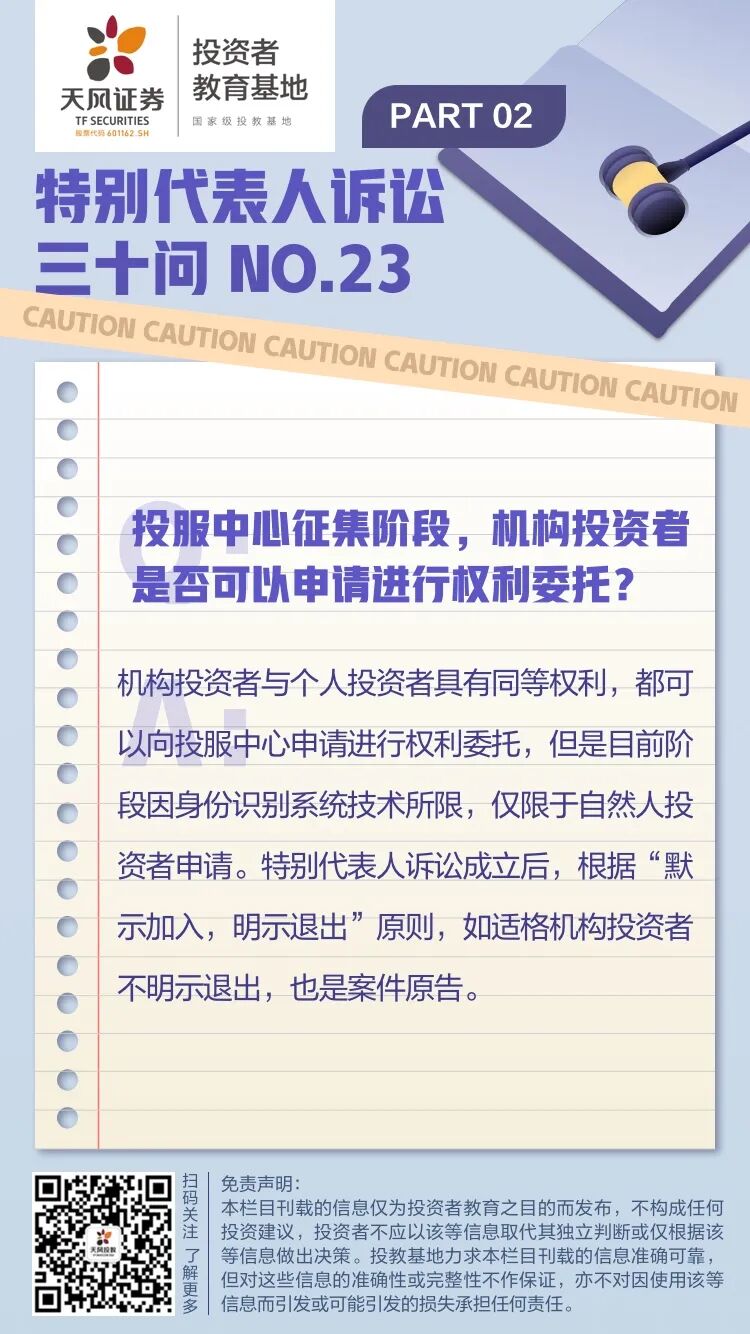 为科普和宣传证券纠纷特别代表人诉讼,天风证券投教基地推出了“特别代表人诉讼三十问”特别专题栏目,将按照投保公司发布的特别代表人诉讼相关概念、知识,每天带您了解一个要点,敬请您关注!