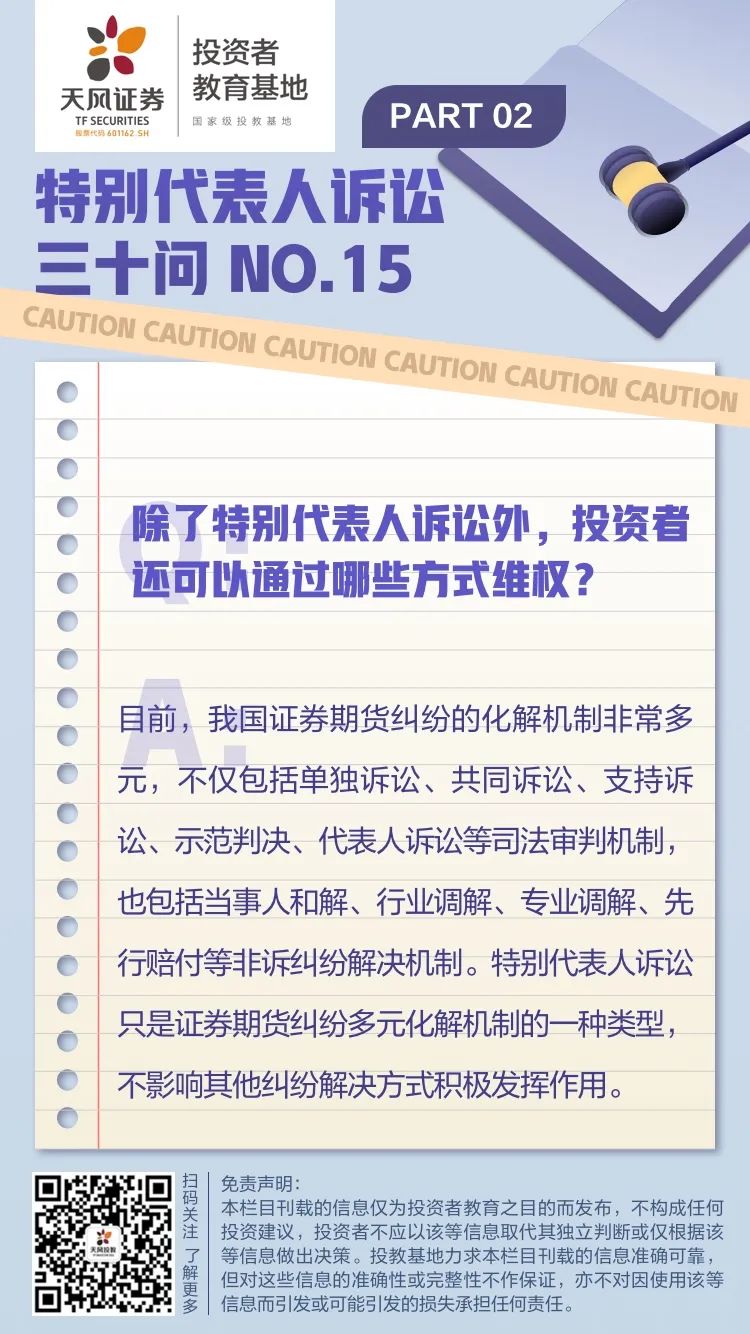 为科普和宣传证券纠纷特别代表人诉讼,天风证券投教基地推出了“特别代表人诉讼三十问”特别专题栏目,将按照投保公司发布的特别代表人诉讼相关概念、知识,每天带您了解一个要点,敬请您关注!
