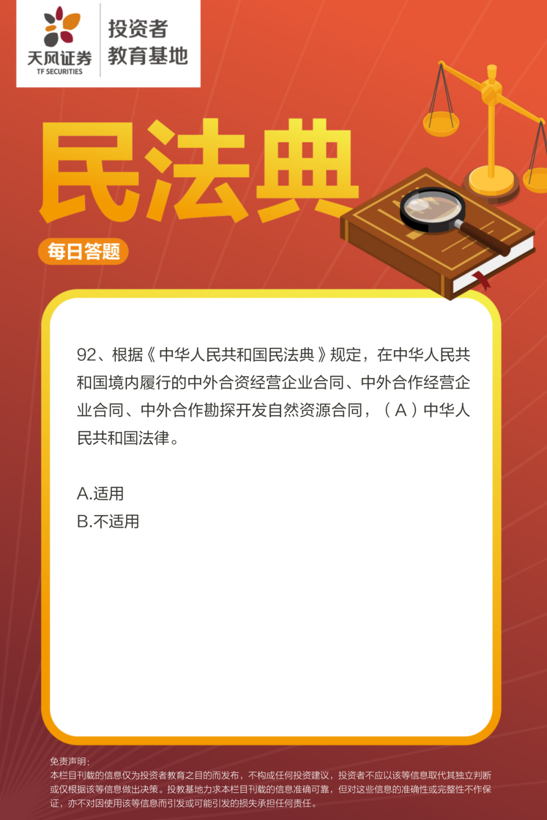 为全面贯彻落实党的二十大和二十届二中全会精神,深入学习宣传贯彻习近平法治思想,引导投资者深入学习民法典,重点宣传平等、自愿、公平、诚信等基本原则,促进经济高质量发展营造良好法治环境,天风证券投教基地特别开展民法典每日答题互动活动,欢迎广大投资者参与。