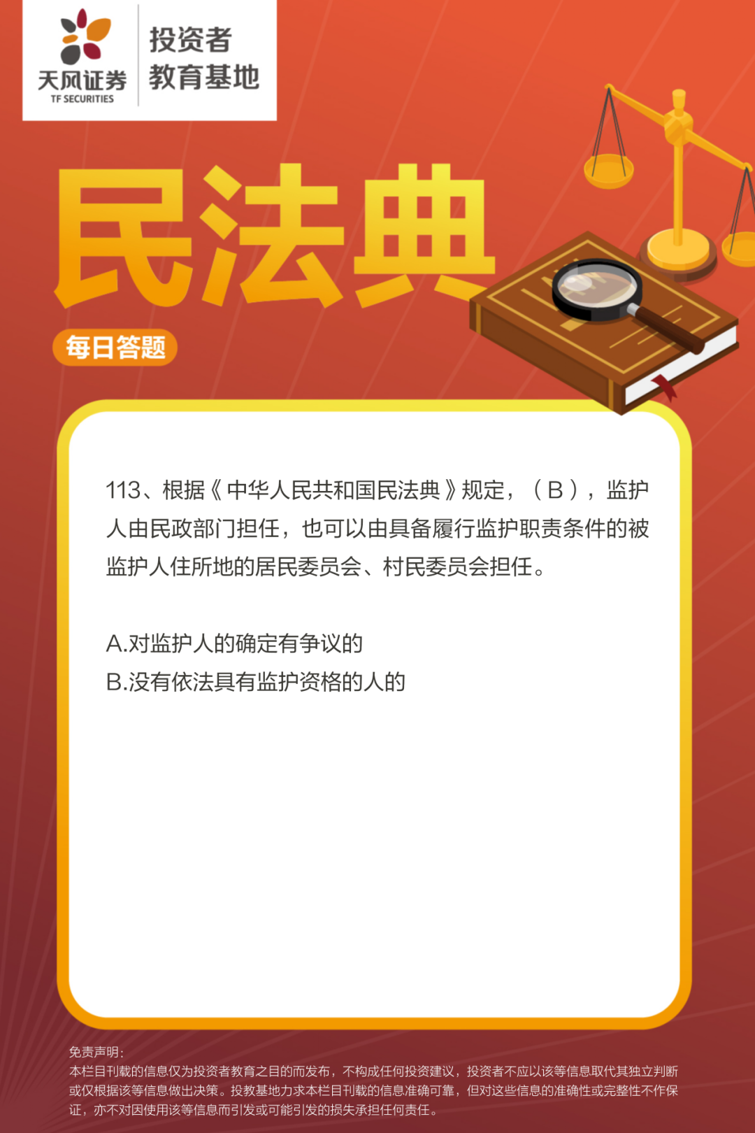 为全面贯彻落实党的二十大和二十届二中全会精神,深入学习宣传贯彻习近平法治思想,引导投资者深入学习民法典,重点宣传平等、自愿、公平、诚信等基本原则,促进经济高质量发展营造良好法治环境,天风证券投教基地特别开展民法典每日答题互动活动,欢迎广大投资者参与。