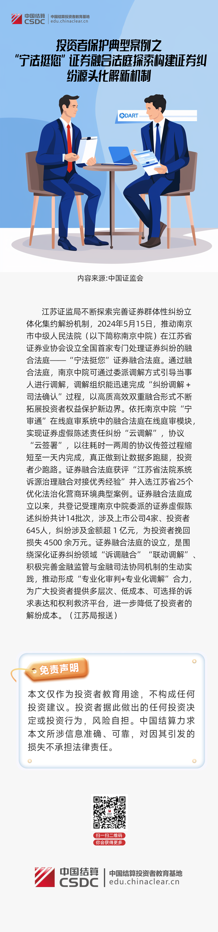 中国结算投教 | 投资者保护典型案例之“宁法挺您”证券融合法庭探索构建证券纠纷源头化解新机制