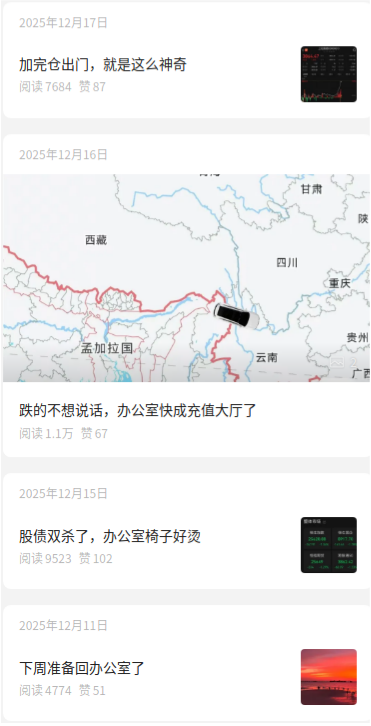 关于这个过程,背景也是海了厚,容阿南我多介绍两句。“北落的师门”确实有份工作,事实上他就是老板,但是去年他确实几个月不上班,全中国到处游山玩水,那么中间有几次回办公室的时候,市场就会大跌。慢慢地,他回去上班市场就大跌,成了一个梗。为此很多网友都劝他不要回办公室。