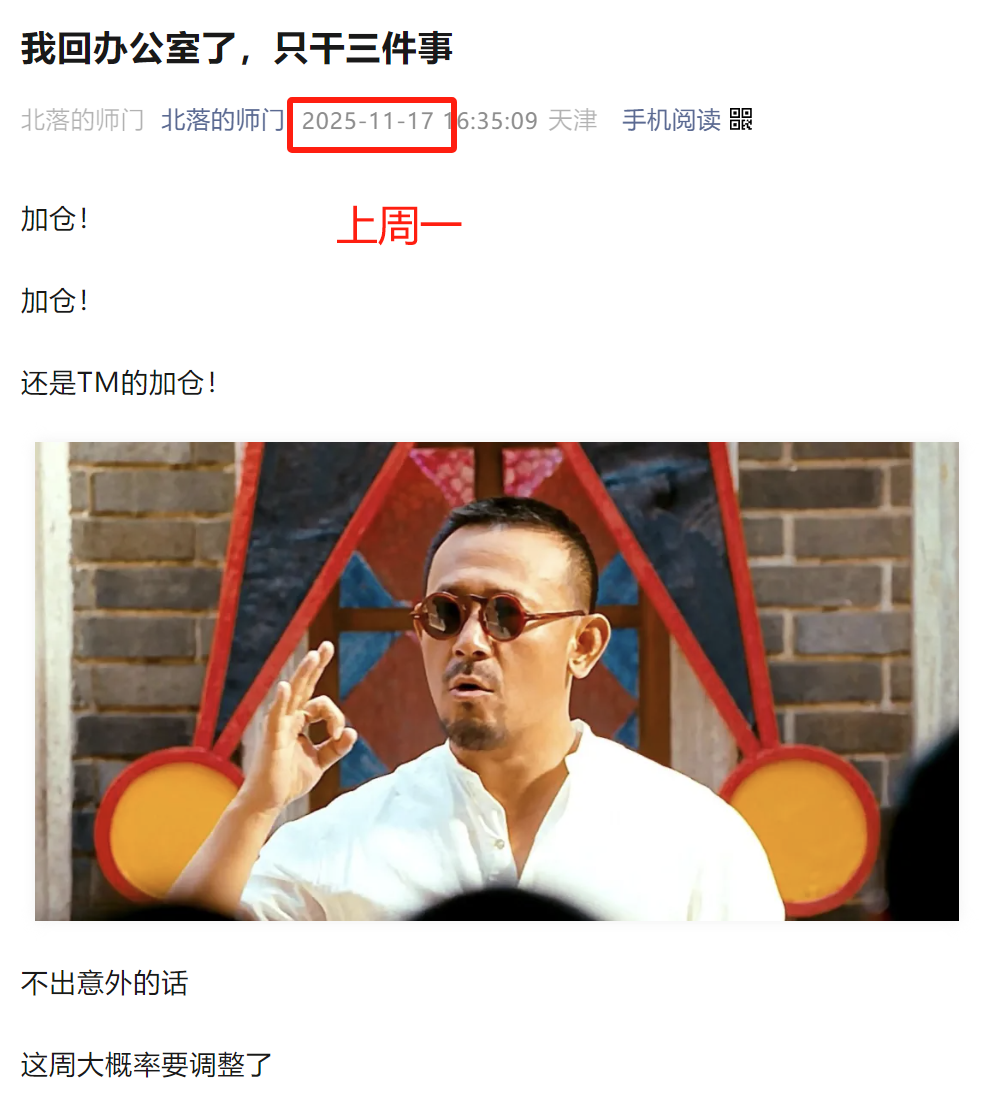 你看,去年12月11日他说准备回办公室了,大盘就跌了85个点,科创板和创业板跌得更多,然后他就加仓,加完仓出门那天,大盘当天就涨了46个点,3天后就把坑填好了。不是说他神啊,他一点都不神,比如这个: