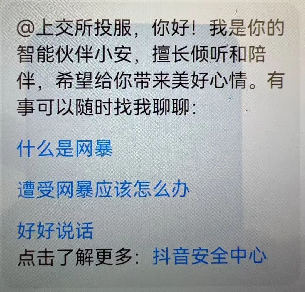 这也导致平台的智能伙伴小安在账号开通不久就来疯狂关心小李,贴心提提示“遭受网暴应该怎么办”这个话题。