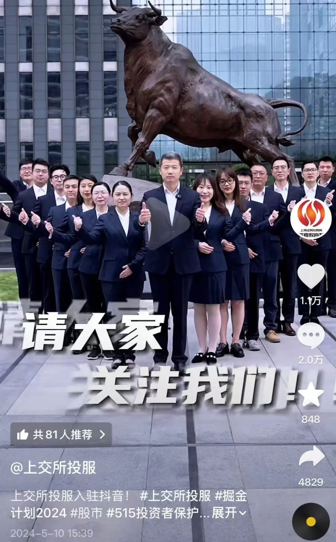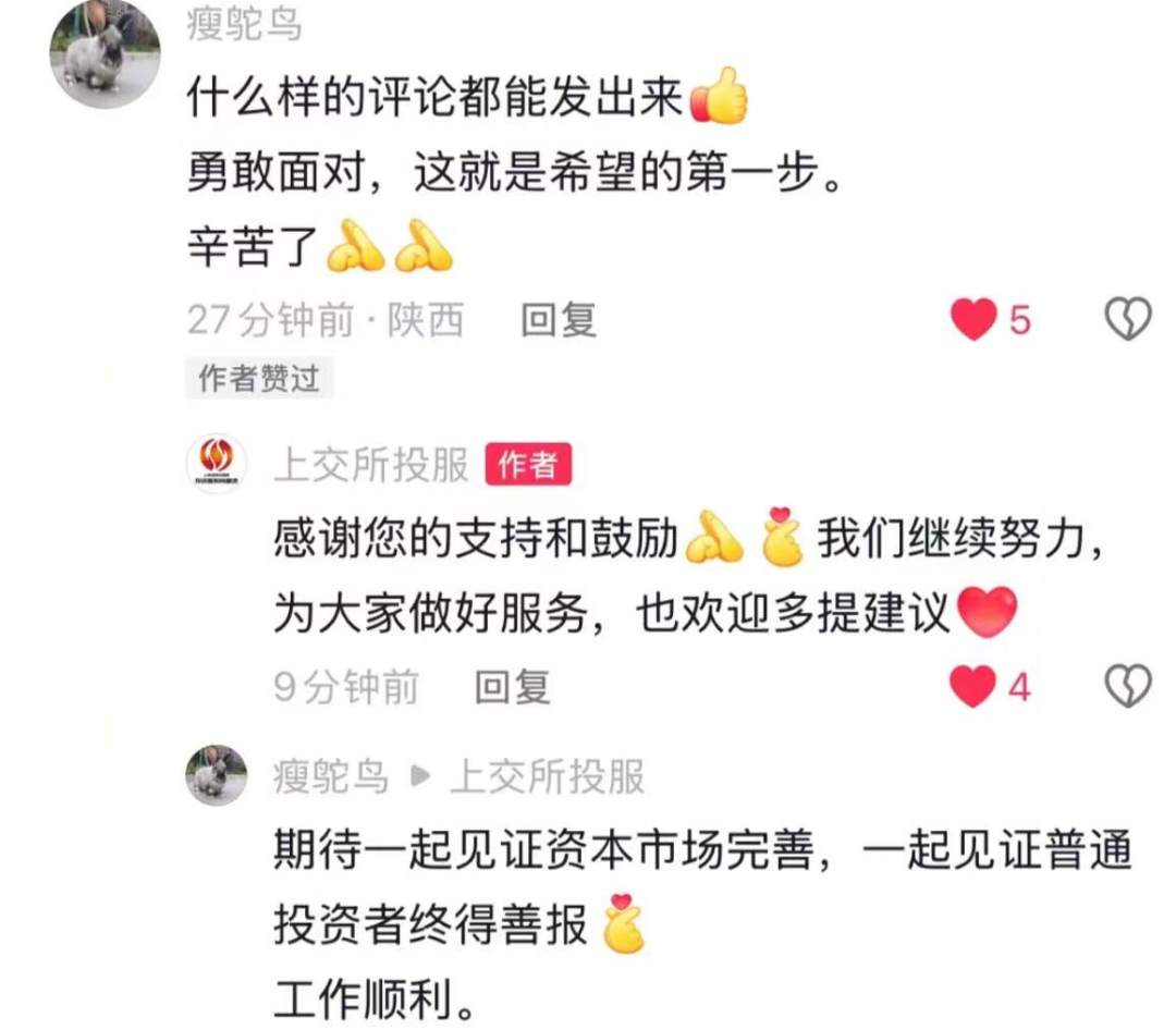 所以,在“把电充绿,把尿喝白”之外,我们决定先做自己的“三投资”,也就是到流量平台上连接、服务和陪伴更多投资者。2024年5月10日,“上交所投服”dy号正式开通,并开放了评论区。