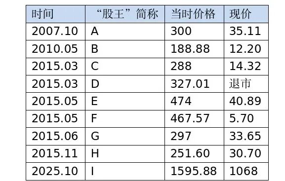 用“股王”举个例子,那些股价曾经超过茅台的时髦股,我看万得做了一张图,换成表格咱们看看: