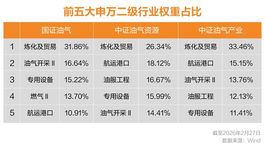 随着国际地缘因素的持续动荡,石油行业相关的ETF正在受到投资者关注。目前主流的石油行业相关ETF主要跟踪三个指数:国证油气 (399439)、中证油气资源 (931248) 和 中证油气产业 (H30198)。虽然它们都重仓“三桶油”,但在产业链覆盖的广度与深度上存在显著的结构性差异。 国证油气指数相对更聚焦油价敏感度最高的上游勘探与生产领域。对“三桶油”的合计权重最大;中证油气资源指数向下游迈出一步,除“三桶油”外,重点配置了油服工程和油运龙头。聚焦“资源开采”与“开采服务”,兼顾了资源属性与服务周期;中证油气产业覆盖行业范围更广,不仅包含上游,还深度纳入中下游炼化与化工板块。指数波动受宏观经济和化工品周期影响更大。在油价过高抑制下游需求时,表现可能弱于纯上游指数;但在经济复苏期弹性较好。 看多高油价与高股息: 若投资者预判油价维持高位震荡,且看重央企的高分红属性,国证油气与中证油气资源相对更加匹配投资者需求。 看多经济复苏与化工周期:若投资者预判宏观经济回暖将带动下游化工品需求修复,或者担忧超高油价压缩炼厂利润,则中证油气产业指数具备更好的防御性和顺周期弹性。 对于希望配置海外油气资产的投资者,QDII基金提供了另一种路径。其主要跟踪的指数主要包括标普石油天然气上游股票指数 (SPSIOP)、道琼斯美国石油开发与生产指数以及标普全球石油指数。目前QDII相关的部分油气基金受额度限制原因处于溢价交易状态,敬请注意投资风险。 最后需要提醒大家,石油行业属于强周期行业,受地缘政治、全球经济增速及能源转型政策影响巨大。ETF投资需关注二级市场溢价率,避免在大幅溢价时盲目追高。