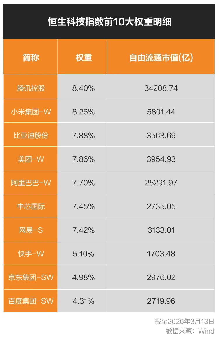 恒生科技指数确实采用的是“自由流通市值加权”的方法。按理说,自由流通市值越大的公司,权重应该越高。但这里有一个关键的机制:个股权重上限限制。为了防止某几家超级巨头“一家独大”,恒生指数公司在编制规则中设定了一道严格的“紧箍咒”:规定非外国公司成份股的个股权重上限为8%(外国公司成份股个股上限为4%,合计不超过10%)。这意味着无论一家公司的自由流通市值有多大,它在指数中的权重最高只能到8%。尽管排名前几位的巨头企业在绝对市值上可能相差几千亿甚至上万亿港元,在指数计算时,它们的权重都会被“拉”到同一个水平线附近(通常是8%或略低)。超过的部分,在每季度一次的指数定期调整中,会被动“砍掉”,多余的权重将重新分配给其他成分股。这就是为什么我们在前几大成分股的权重却非常接近,基本都在8%左右徘徊。