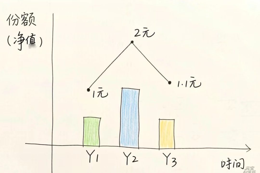 那我们怎么把握一只基金的投资者是否跑赢了基金本身呢?通常就用基金加权平均净值利润率来衡量。这个指标不仅考虑基金净值的变化,同时也考虑基金份额的变化。像下图,虽然只看净值,基金最终实现了10%的收益(1元涨到1.1元),但考虑到这只基金有一半份额是在2元高点追进的,那么基金的加权平均净值利润率会打对折。