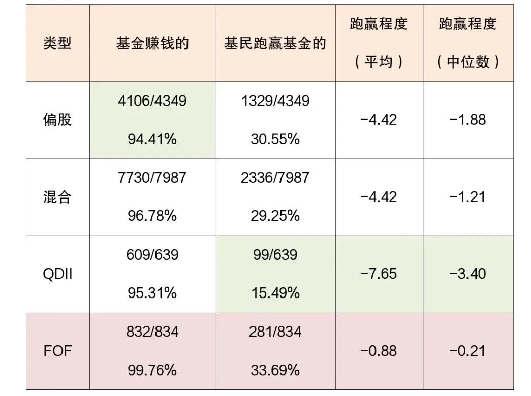 阿南统计了4349只数据的偏股型基金,其中4106只基金去年能赚到钱,但投资者跑输基金的高达3021只,跑输比例高达69.45%——这已经改善不少了,我看网友统计2024年半年报情况,当时跑输概率高达81 %!