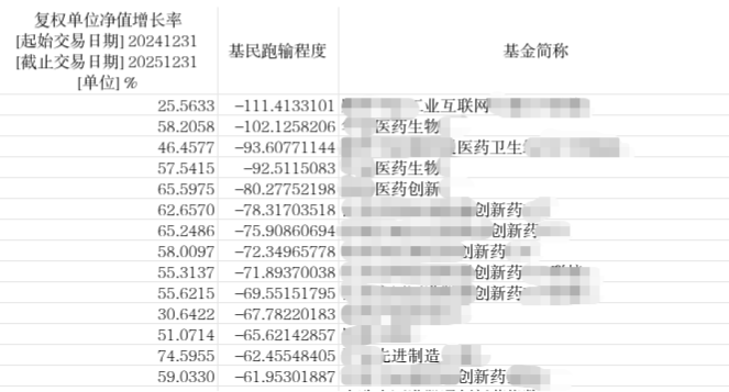 这是基民跑输较多的一组基金情况,可以看到医药股是重灾区。但是明明,这些基金的净值在2025年上涨不少(看最左侧那列),大多数全年涨幅在50-60%,但基民跑输更多。